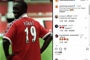 曼联官方社媒晒出约克身穿本队球衣的照片,配文:“祝德怀特-约克54岁生日快乐。”