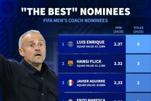 体育资讯11月7日讯 FIFA公布年度最佳男足教练候选名单,德国转会市场列出了入围者上赛季的成绩。