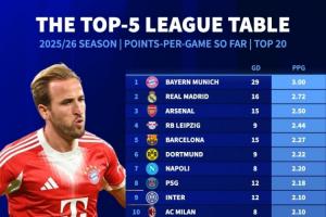 体育资讯11月08日讯 德转统计了新赛季至今五大联赛球队的场均积分榜,其中拜仁全胜场均3分排在榜首,皇马、阿森纳分列二三。