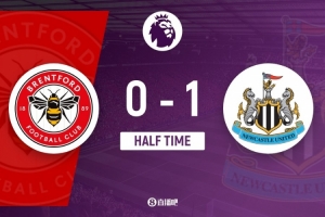伤停补时5分钟。上半场比赛结束,布伦特福德0-1纽卡斯尔联。