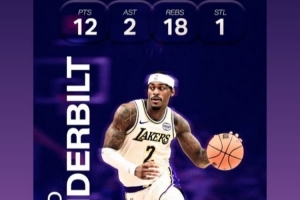 昨天湖人客场102-122不敌老鹰,5连胜终结。范德比尔特出战28分钟,9投4中,三分2中1,罚球3中3砍下12分18篮板2助攻1抢断1盖帽,篮板湖人生涯新高。