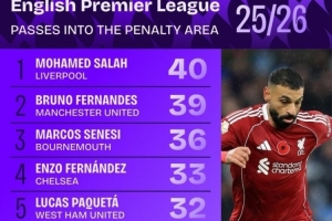体育资讯11月11日讯 英超联赛已经进行了11轮,squakwa也统计了本赛季英超传球到禁区内次数情况,萨拉赫力压B费居首。