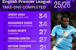本赛季英超成功过人榜:
