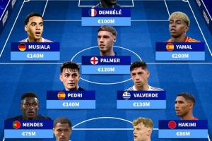 前锋:穆西亚拉(拜仁,德国,1.4亿欧)、登贝莱(巴黎圣日耳曼,法国,1亿欧)、亚马尔(巴萨,西班牙,2亿欧)