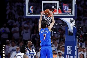 雷霆内线霍姆格伦上半场表现活跃,不仅有突破单手劈扣的精彩表现,篮板拼抢和防守上也充分发挥他的身高优势和灵活性。