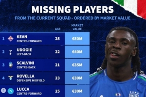 体育资讯11月18日讯 德转统计了缺席本期意大利队球员的身价并列出榜单,佛罗伦萨前锋小基恩5000万欧居首,热刺左后卫乌多吉4000万欧第二。