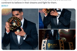 体育资讯11月20日讯 阿什拉夫当选2025年非洲足球先生,他在社交媒体上晒出领奖照片,发表获奖感言。