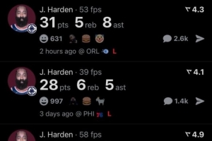 过去四场比赛,哈登都砍下了25+5+5的数据,据数据媒体Real Sports,36岁87天的哈登是达成这一成就的最老后卫。