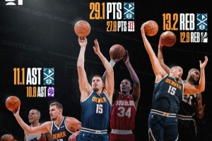 约基奇赛季至今场均29.1分13.2篮板11.1助攻