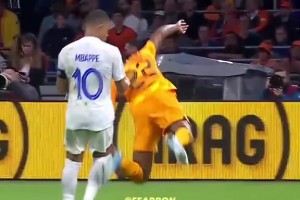 邓弗里斯遭对手倒勾爆头痛苦倒地,缓了一下后继续比赛
