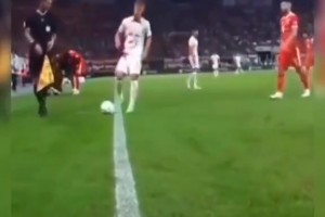 邓弗里斯遭对手倒勾爆头痛苦倒地,缓了一下后继续比赛
